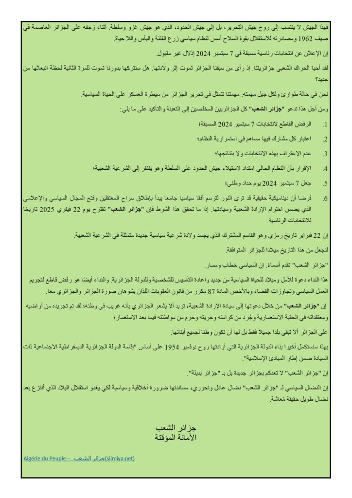 Appel-aux-Patriotes-algeriens_8mai2024_arabe 📄 يمكنكم تحميل الوثيقة إذا أردتم ذالك ؟ Appel-aux-Patriotes-algeriens_8mai2024_francais 📄 Vous pouvez télécharger ce document PDF si vous le souhaitez ? Navigation de l’article Paris, 9 avril 2024, Commémoration de l’Assassinat de Ali Mecili Rassemblement de la Diaspora Algérienne du 25 mai 2024 à Bruxelles – La grandeur du Hirak Populaire et Le vrai visage du régime Algérien – عظمة الحراك الشعبي و الوجه الحقيقي للنظام الجزائري
