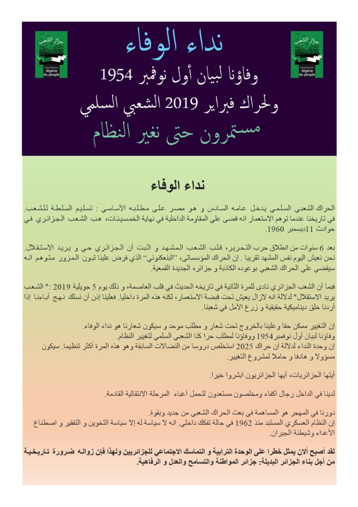 Fidèle à l’esprit de novembre 1954 – الوفاء لروح نوفمبر 1954 Navigation de l’article De quoi l’Algérie de Tebboune est-elle le nom ? Un deuxième « Premier Novembre » pour refonder l’Algérie qui nous rassemble – أول نوفمبر ثانٍ لإعادة بناء الجزائر التي تجمعنا